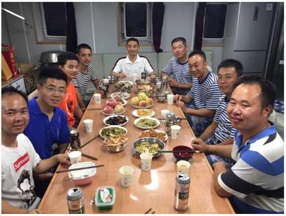 9月12日,南昌舰被“福宁拖”吊拖一天后,由于受到14号台风“莫兰蒂”的影响,南昌舰停靠在山东威海石岛港外抛锚避风。9月15日,农历八月十五,舰上人员以及我公司船员在海上过了一个独具意义的中秋节。